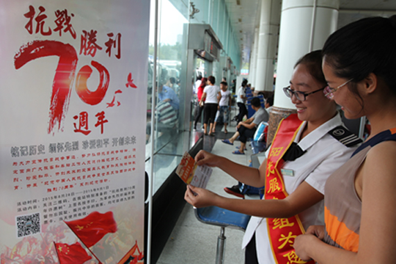 車站在候車長廊擺放了紀念抗戰勝利70周年的宣傳展板,向乘車旅客講解先烈英勇抗日的光輝歷史,并在“抗戰勝利70周年紀念許愿樹”上簽名,緬懷先烈的豐功偉績,牢記歷史,珍惜和平,勿忘國恥、振興中華。參加簽名紀念活動的旅客可以得到“紀念世界反法西斯戰爭勝利70周年”版優惠乘車卡,享受購票9折優惠。